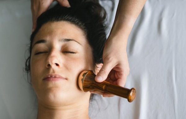 Massage allongé du visage avec une kansa wand (baguette en bois) puis avec les mains en englobant la nuque et pose d'un masque à l'argile.